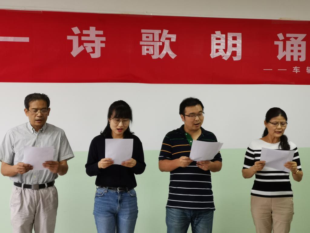 朗诵会上,各室推选出一至三支代表队伍,其中,学院院办由党总支书记、副院长邓北川、综合管理科科长赵坤等朗诵《先给亲爱的祖国》,院长、党总支副书记张耀虎朗诵《我是一滴水》,车辆工程教研室朗诵《祖国颂》、《歌唱祖国》和《辽阔的祖国》,车辆运用教研室朗诵《我爱这土地》、《我爱我的祖国》,学生管理科朗诵《我的祖国》,实验室朗诵《祖国》。朗诵会上,各组队伍以铿锵有力的气势,充沛饱满的爱国热情赢得了全场教师的阵阵掌声,会场气氛非常热烈。