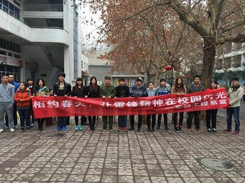 3月5日,为响应向雷锋同志学习的号召,继承发扬雷锋精神。车辆与医电工程系团总支举办了系列学雷锋志愿者活动。中午在第一综合食堂前隆重进行了“相约春天,让雷锋精神在春天闪耀”为主题签名活动,下午在学院离退办进行卫生清洁活动.