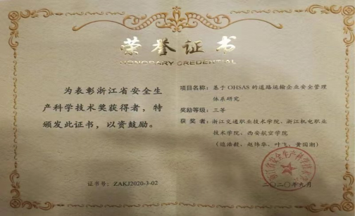 基于OHSAS的道路运输企业安全管理体系研究”获得浙江省安全生产科学技术三等奖