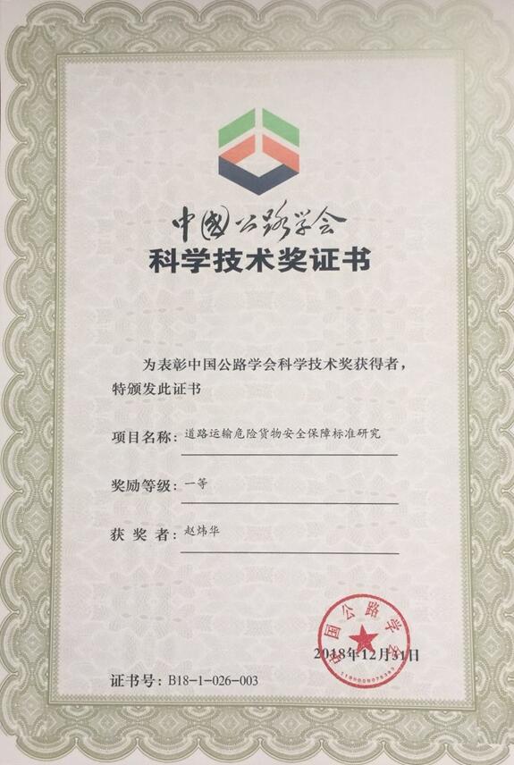 “道路运输危险货物安全标准研究”获得中国公路学会一等奖
