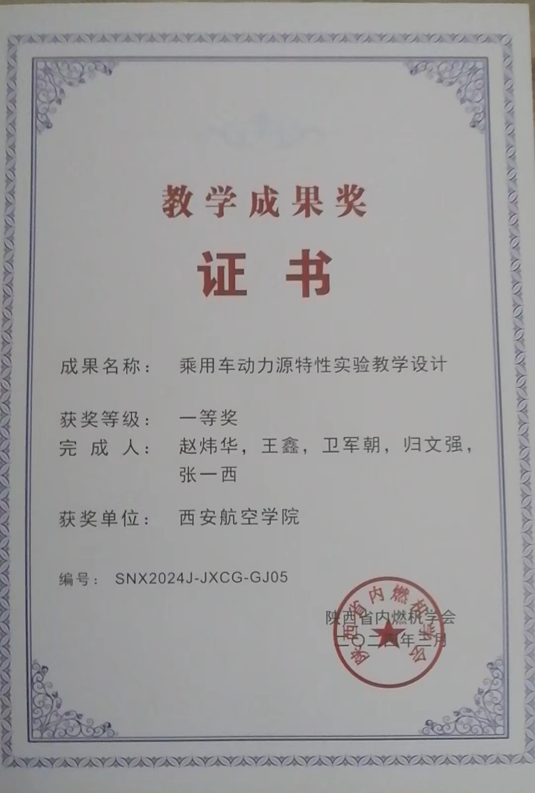 获陕西省内燃机学会教学成果一等奖